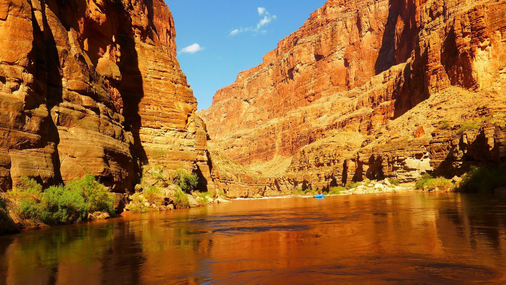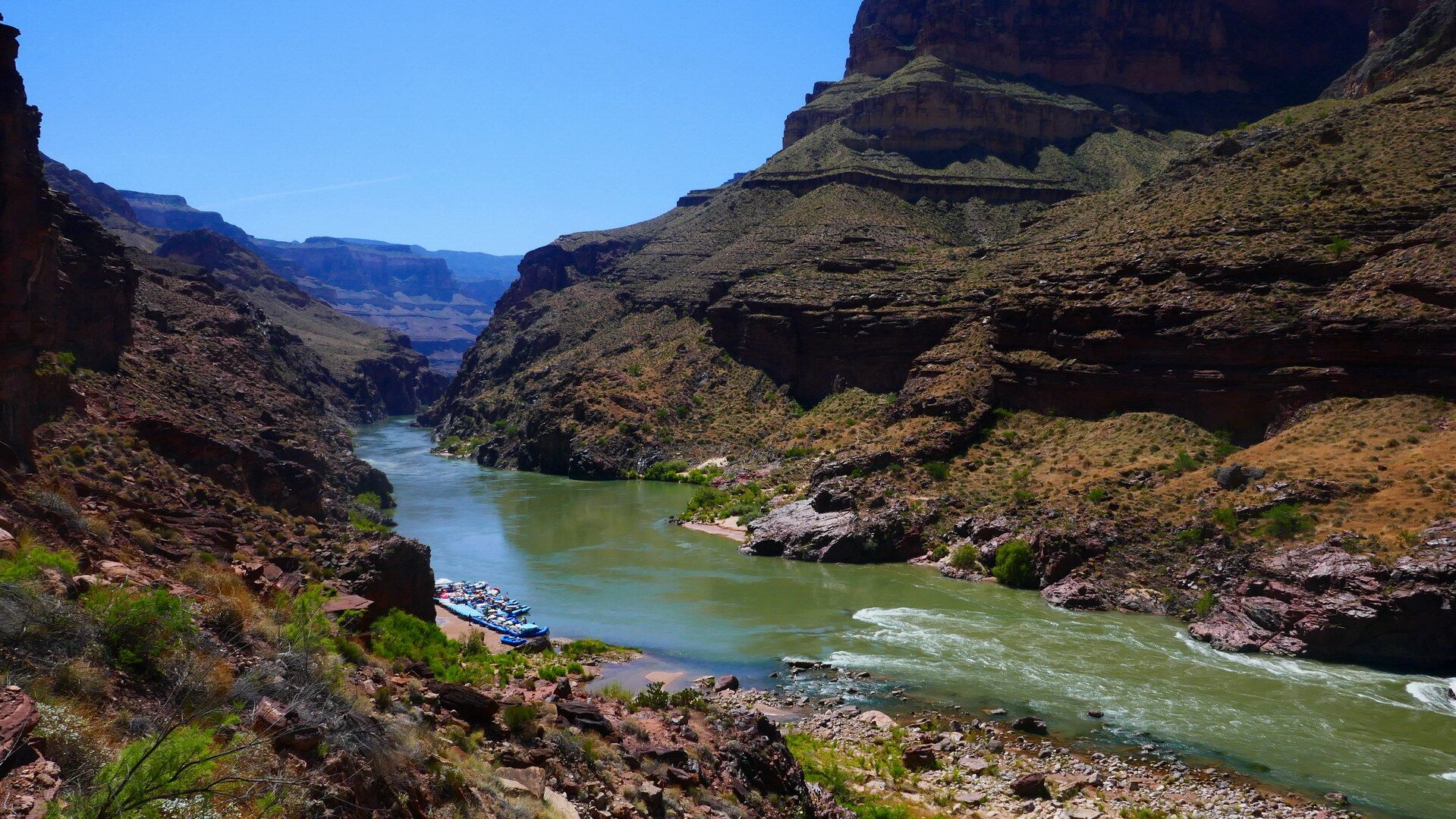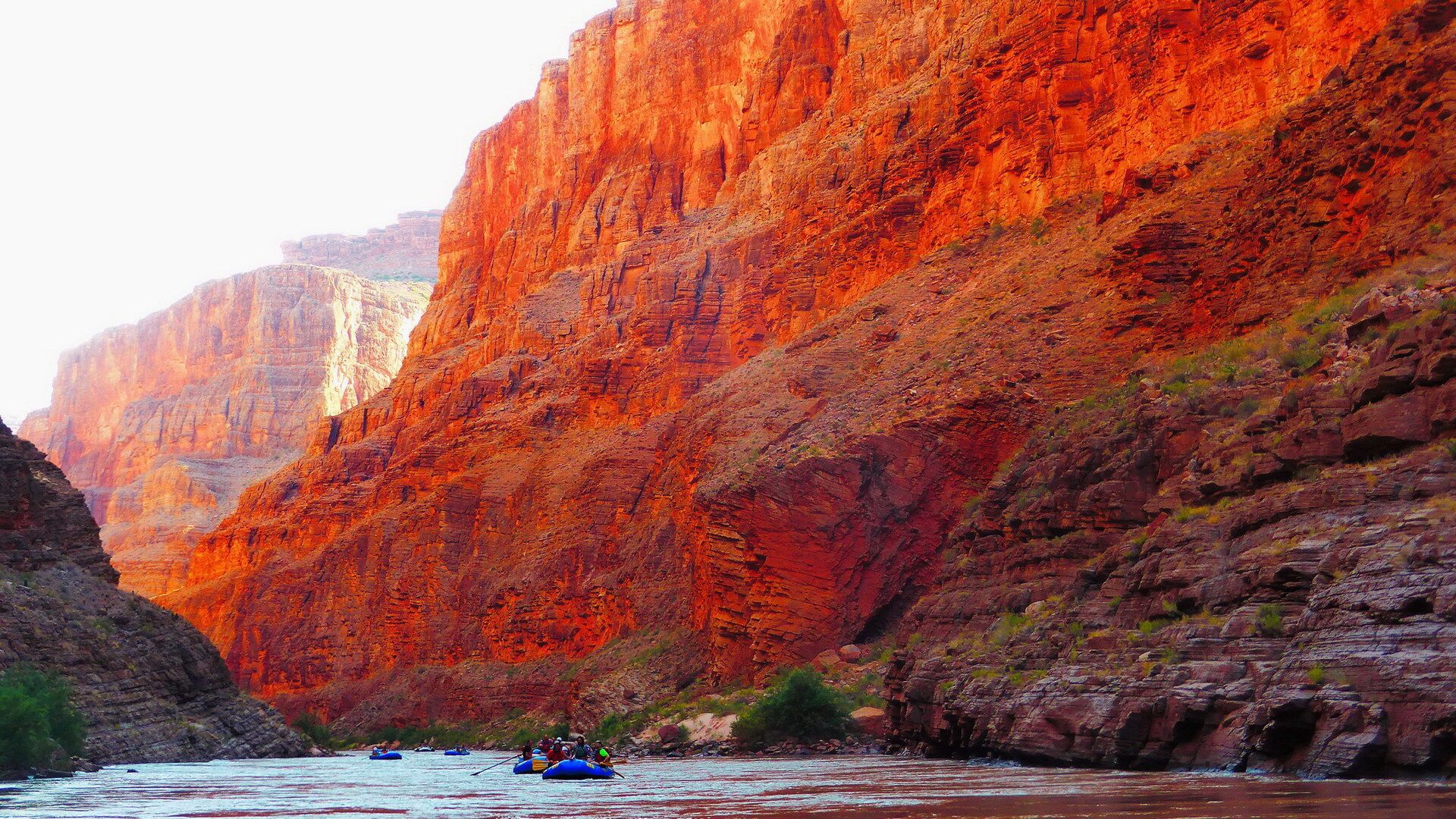 Und jetzt geht's los! Frühmorgens beginnen wir den Abstieg vom South Rim (ca. 2100m) bis hinab zum Colorado River (ca. 800m). Wir lassen uns Zeit und genießen immer wieder die grandiosen Ausblicke. Unten angekommen besteigen wir die Spezial-Schlauchboote, auf denen wir in den nächsten Tagen die grandioseste Schlucht der Welt erleben werden. Neben dem Abenteuer auf dem mal ruhigen, mal turbulenteren Wasser an sich werden wir kleine Wanderungen in geheimnisvolle Seitencanyons zu den Ruinen längst vergangener Indianerkulturen unternehmen, erfrischende Bäder in den kühlen Fluten des Colorado genießen und abends unser Lager auf den weißen Sandbänken in den Tiefen des berühmtesten Canyons der Welt aufschlagen.