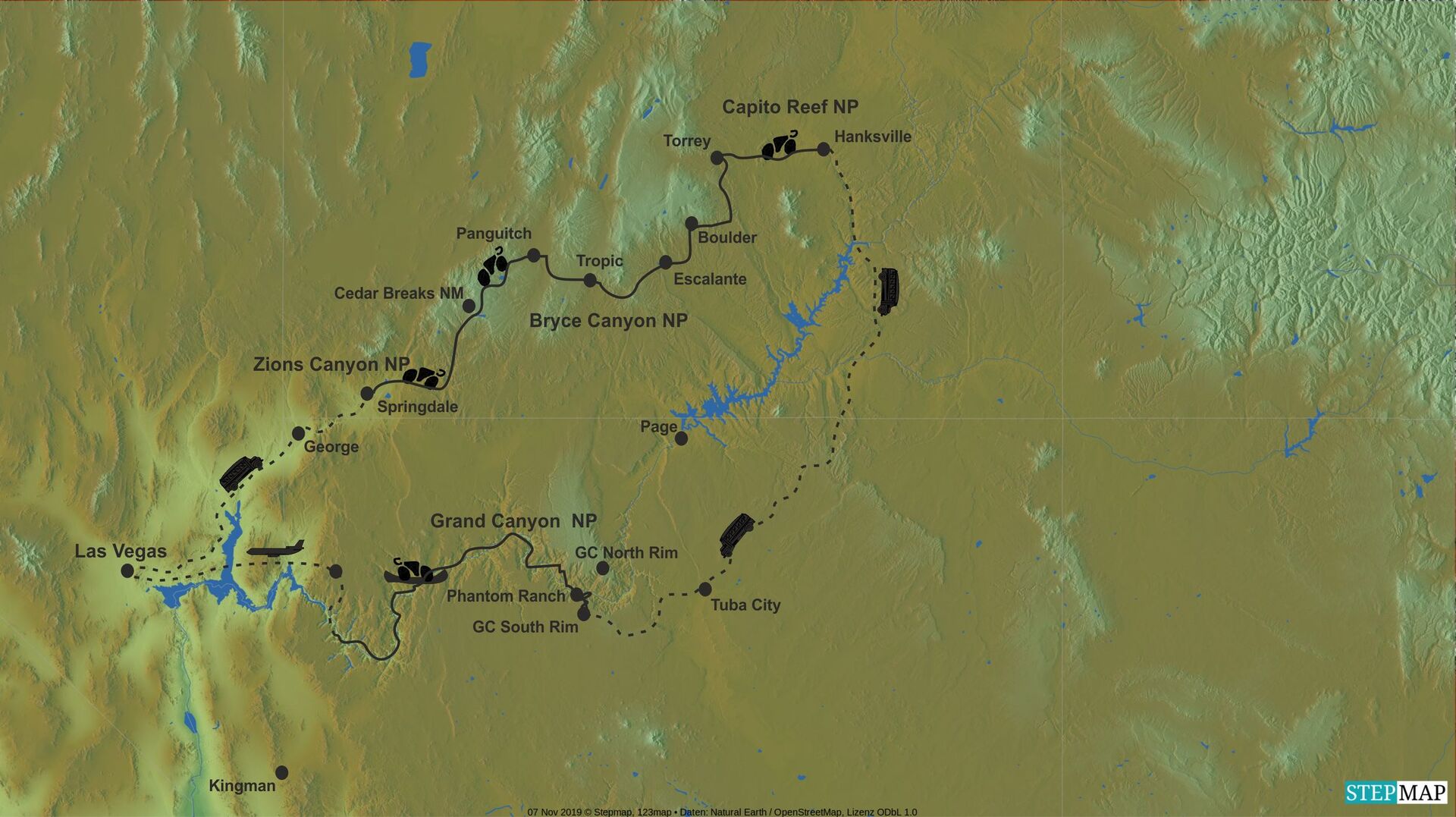 Lasst uns die Fahrräder satteln und nach Las Vegas reiten! Doch bevor wir in Amerikas verrücktester Stadt unser ganzes Taschengeld verspielen können, begeben wir uns lieber in die monumentale Schönheit des Cedar Breaks National Monuments. Hier, an dem mit 3200 Metern höchsten Punkt dieser Reise, laden uns die gefrorenen Überreste des Winters sogar noch zur Schneeballschlacht ein! Nicht weit entfernt schlagen wir zum ersten Mal unser Nachtlager auf und genießen den überwältigenden Sternenhimmel. Weitere Naturwunder des Südwestens folgen ... Zions Canyon-, Bryce Canyon-, Capital Reef- und natürlich der Grand Canyon National Park!
